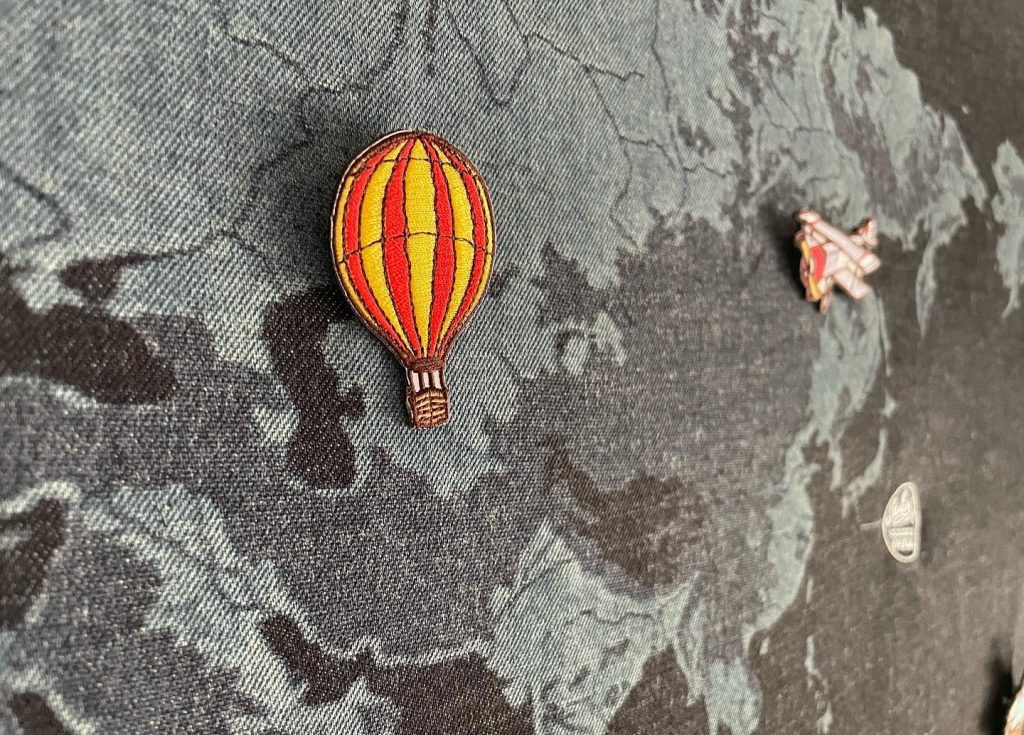 このセルビッチデニムを生のままカーテンに仕立て、その上にレーザー抜染の手法で世界地図をプリント、さらに世界を旅するイメージで、世界地図上の好きな位置にオリジナルワッペンがつけられるようになっています。