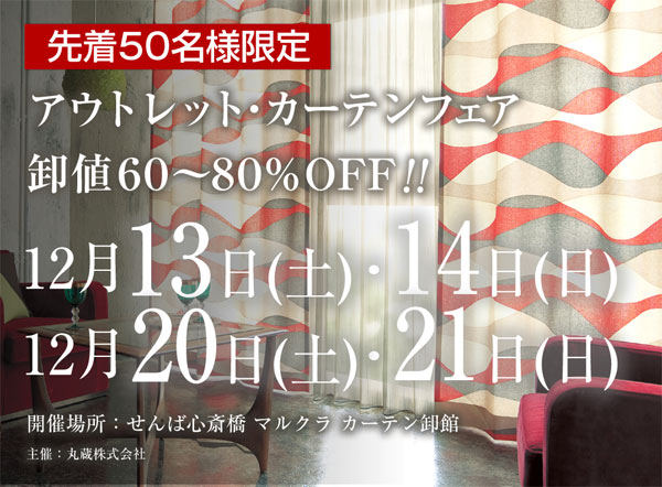せんば心斎橋マルクラ カーテン卸館では12月13日~14日、20日~21日の4日間、「アウトレット・カーテンフェア」を開催いたします。