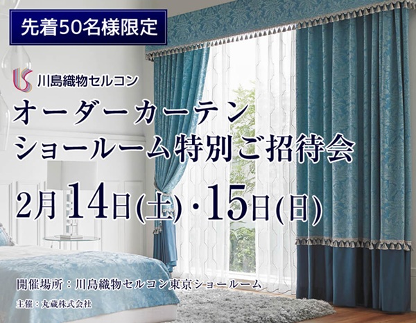 せんば心斎橋マルクラ カーテン卸館では2月14日(土)・15日(日)の2日間限定で川島織物セルコン・東京ショールームにて「オーダーカーテン特別ご招待会」を開催いたします。30名様限定のキャンペーンとなっておりますので、ご予約は下記URLよりお早めにお申込み下さい。
