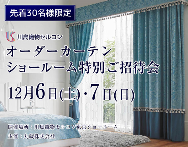 せんば心斎橋マルクラ カーテン卸館では12月6日(土)・7日(日)の2日間限定で川島織物セルコン・東京ショールームにて「オーダーカーテン特別ご招待会」を開催いたします。30名様限定のキャンペーンとなっておりますので、ご予約は下記URLよりお早めにお申込み下さい。