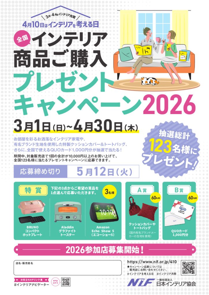 日本インテリア協会(NIF)では、春の新生活シーズンに合わせて「インテリア商品ご購入 プレゼントキャンペーン2026」を開催しています。期間は2026年3月1日〜4月30日です。
