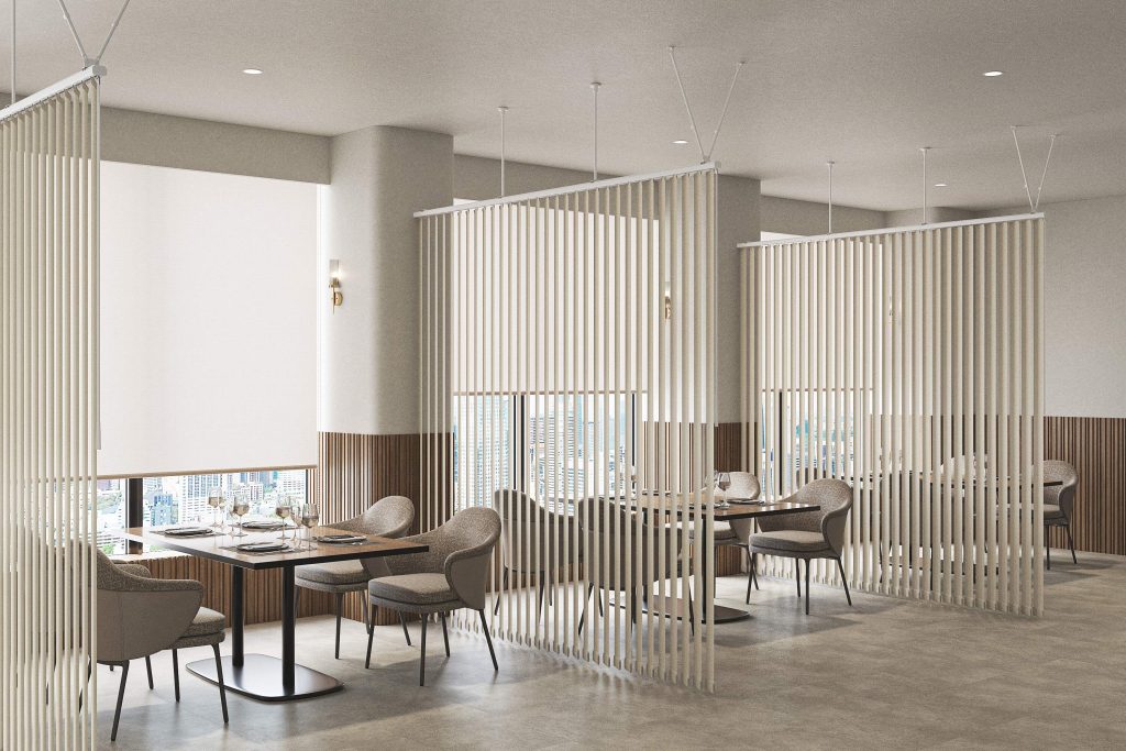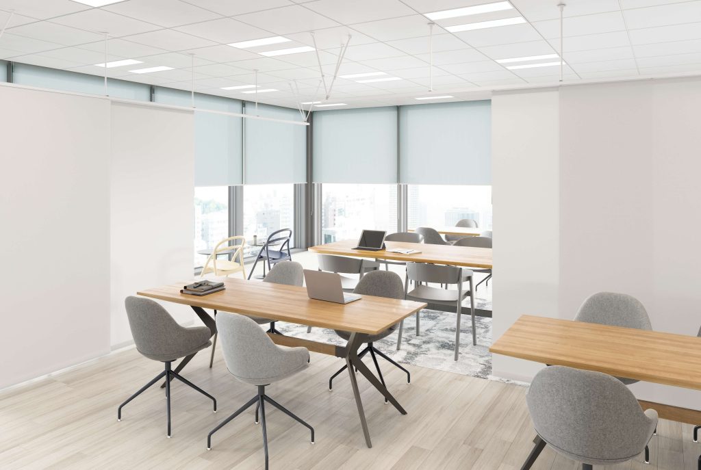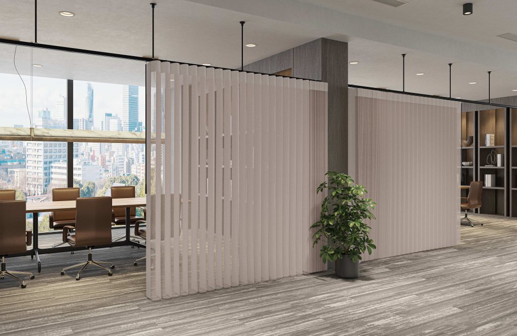 カラーはモノトーンの全4色展開で、周囲の内装と調和しやすく、オフィスやサロンにおいて空間の印象を損なうことなく用途に応じたゾーニングが可能です。さらに、ランナー素材や摩擦抵抗を抑えたレール設計により、操作音は約42dBと静音性にも配慮しており、執務スペースや施術空間など静かな環境にも適しています。