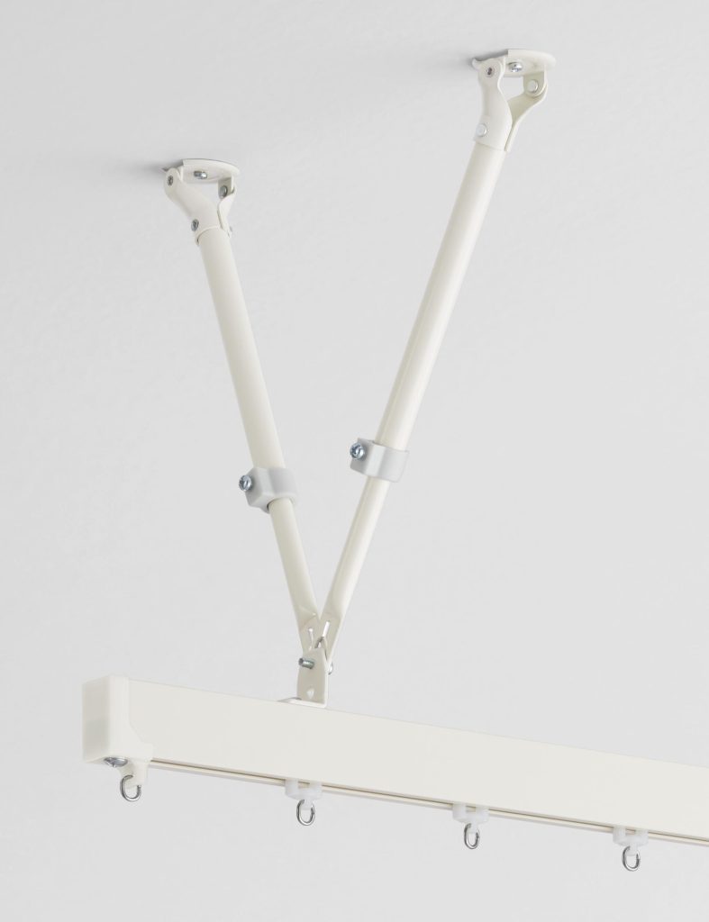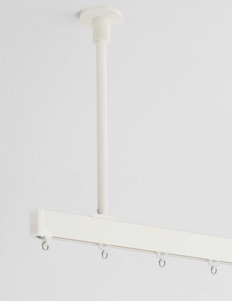 こうしたニーズを背景に、新たな間仕切り用カーテンレール「クロシード」をラインアップします。「クロシード」はフラット形状のシンプルなデザインを採用し、吊棒などを用いて天井から吊り下げることが可能です。空間を仕切りながらもスプリンクラーの散水障害を防ぎ、隣接空間で照明や空調の共有もできるため、簡易的かつ効率的な間仕切りを実現します。